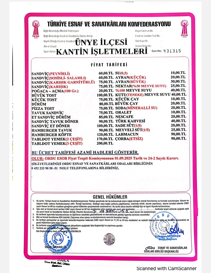Yeni eğitim ve öğretim yılıyla birlikte, Ünye’deki okul kantinlerinde uygulanacak fiyat tarifesi resmen yürürlüğe girdi. 5362 sayılı Esnaf ve Sanatkarlar Kanunu’nun 62. maddesine dayanılarak alınan karar, Ordu Esnaf ve Sanatkarları Odaları Birliği Fiyat Tespit Komisyonu tarafından onaylandı.