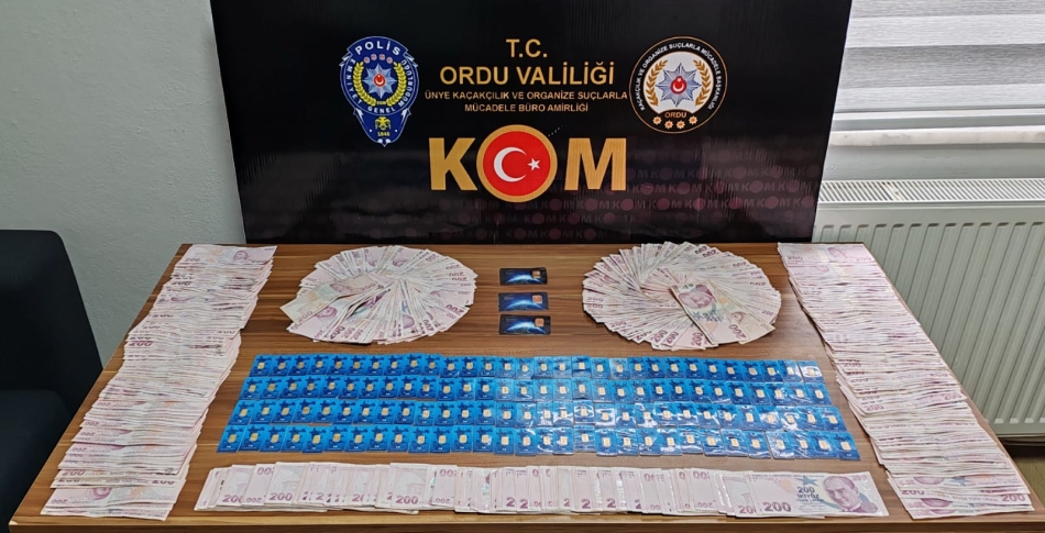 Yine KOM Şube Müdürlüğünce Sahte Altın Kaçakçılığına yönelik yapılan çalışmalar neticesinde; 18.03.2025 günü T.G isimli şüpheli Ünye’de yakalanırken, üst aramasında ve çantasında yapılan aramada; 123 Adet 1gr sahte olduğu değerlendirilen altın, 3 adet 5 gr sahte olduğu değerlendirilen altın, 118.500 TL nakit para ele geçirildı.