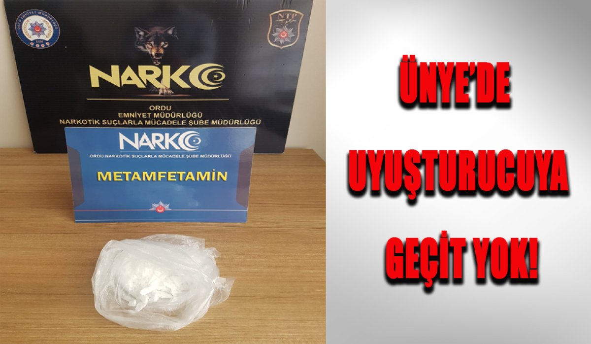 07/07/2022 tarihinde Ünye İlçe Emniyet Müdürlüğü Narkotik Suçlarla Mücadele Grup Amirliğince şüphe üzerine durdurulan bir araçta bulunan iki şüpheli şahsın üzerlerinde, eşyalarında ve araçta yapılan aramada (1) gram Metamfetamin maddesi, (1) adet Ecstasy hap ile (37) adet Sentetik Ecza maddesi ele geçirilmiş olup, haklarında uyuşturucu madde ticaretinden dolayı adli işlem yapılan şüpheli şahıslar sevk edildikleri adli mercilerce tutuklanmışlardır.