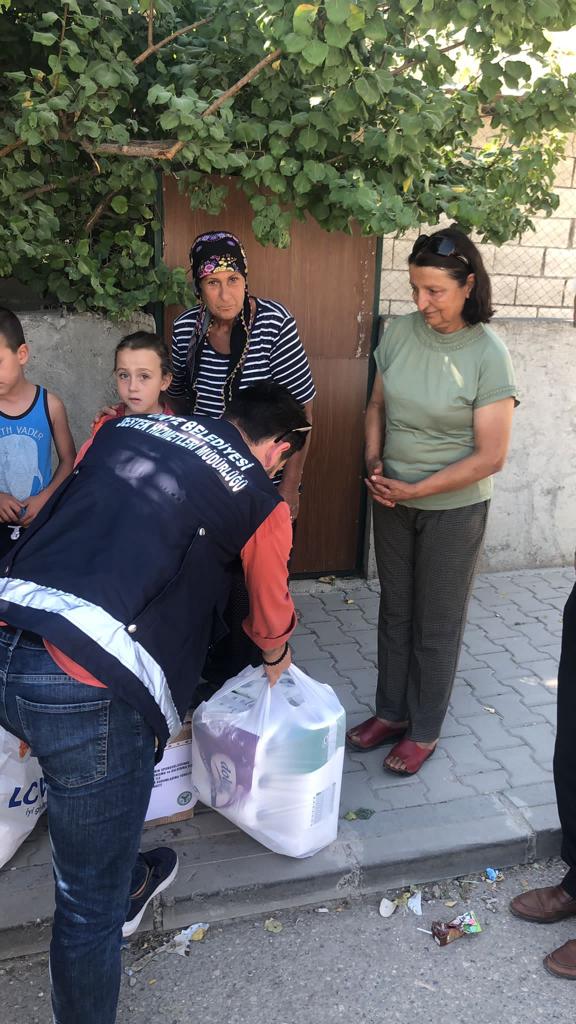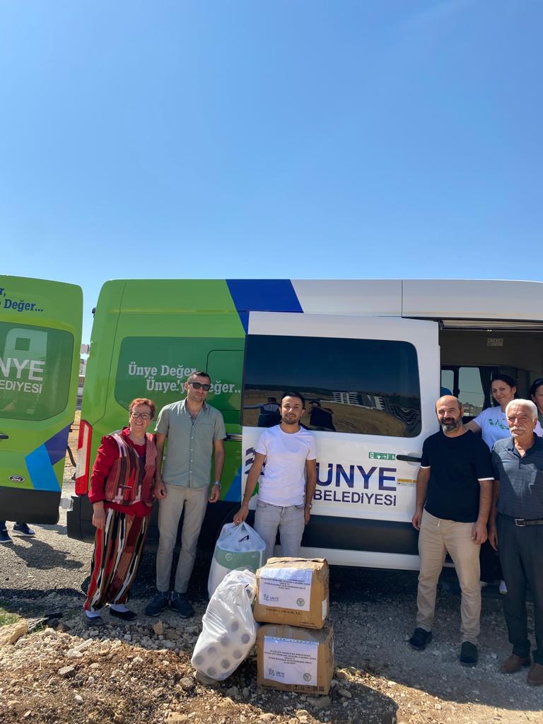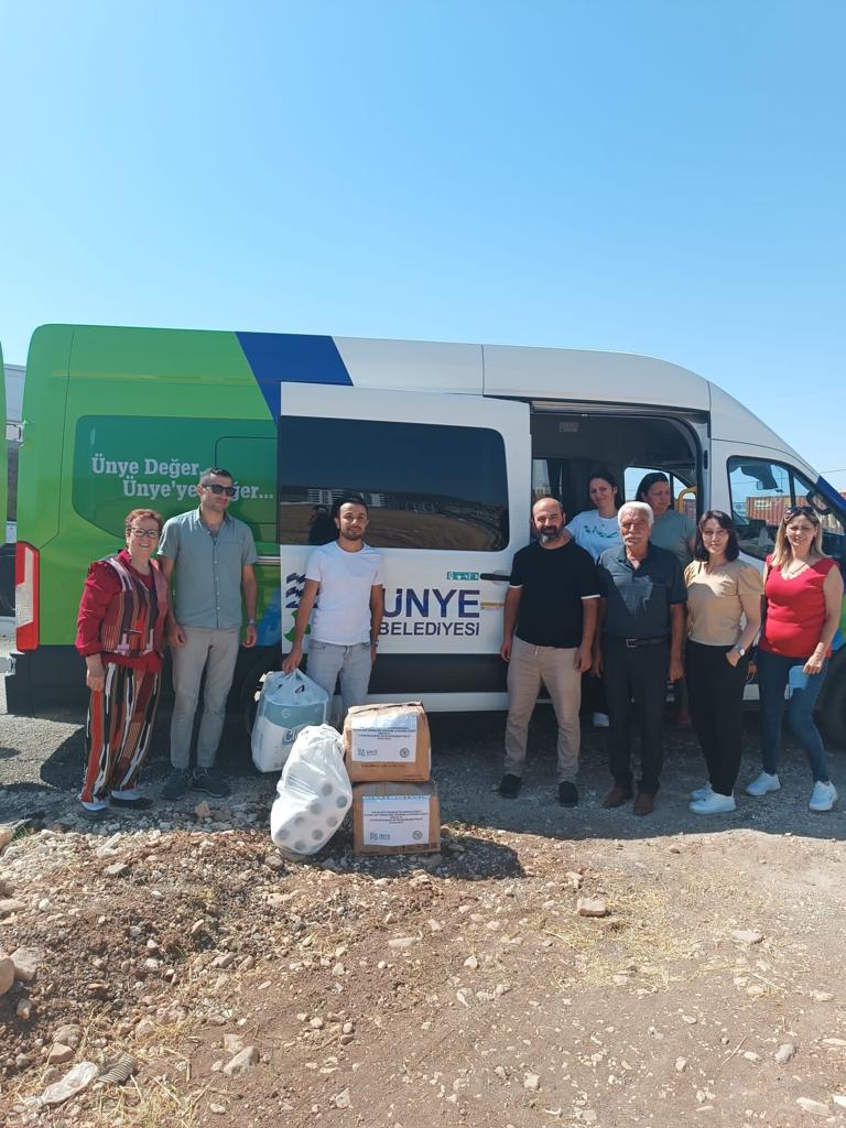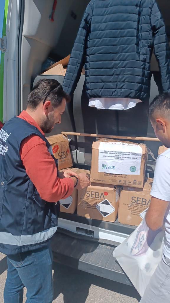 Ünye Belediyesi'nin lojistik destek verdiği yolculukta çoğunluk Adıyaman merkezde olmak üzere depremde evleri hasar görmüş depremzede vatandaşlara temizlik malzemelerinden oluşan koliler dağıtıldı.