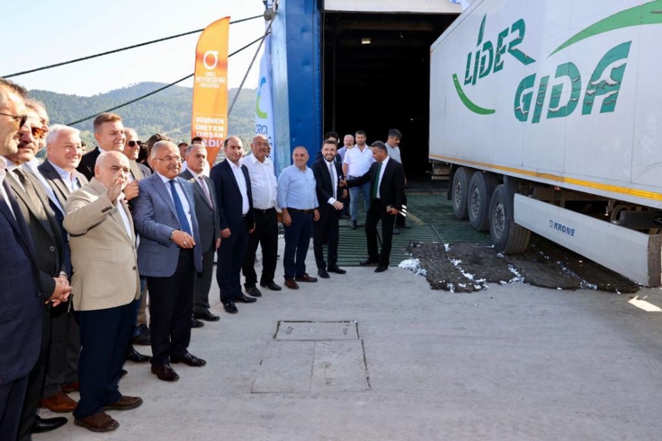 Törenin ardından Ege’den Ordu’ya tırlar ile getirilen sebze ve meyveleri Rusya’ya götürecek olan Ro-Ro gemisi yapılan dua sonrasında kesilen kurdele ile tırlar gemiye yüklendi.