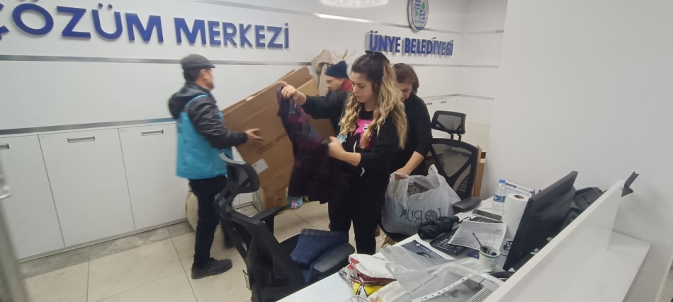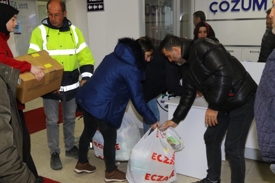 Ünye Belediyesi tarafından sabahın erken saatlerinde yapılan yardım çağrısının ardından Ünyeliler seferber oldu. Vatandaşlar battaniye, uyku seti, çocuk bezi ve kullanılmamış kıyafetlerden oluşan yardım paketlerini Ünye Belediyesi’ne getirerek teslim etti.