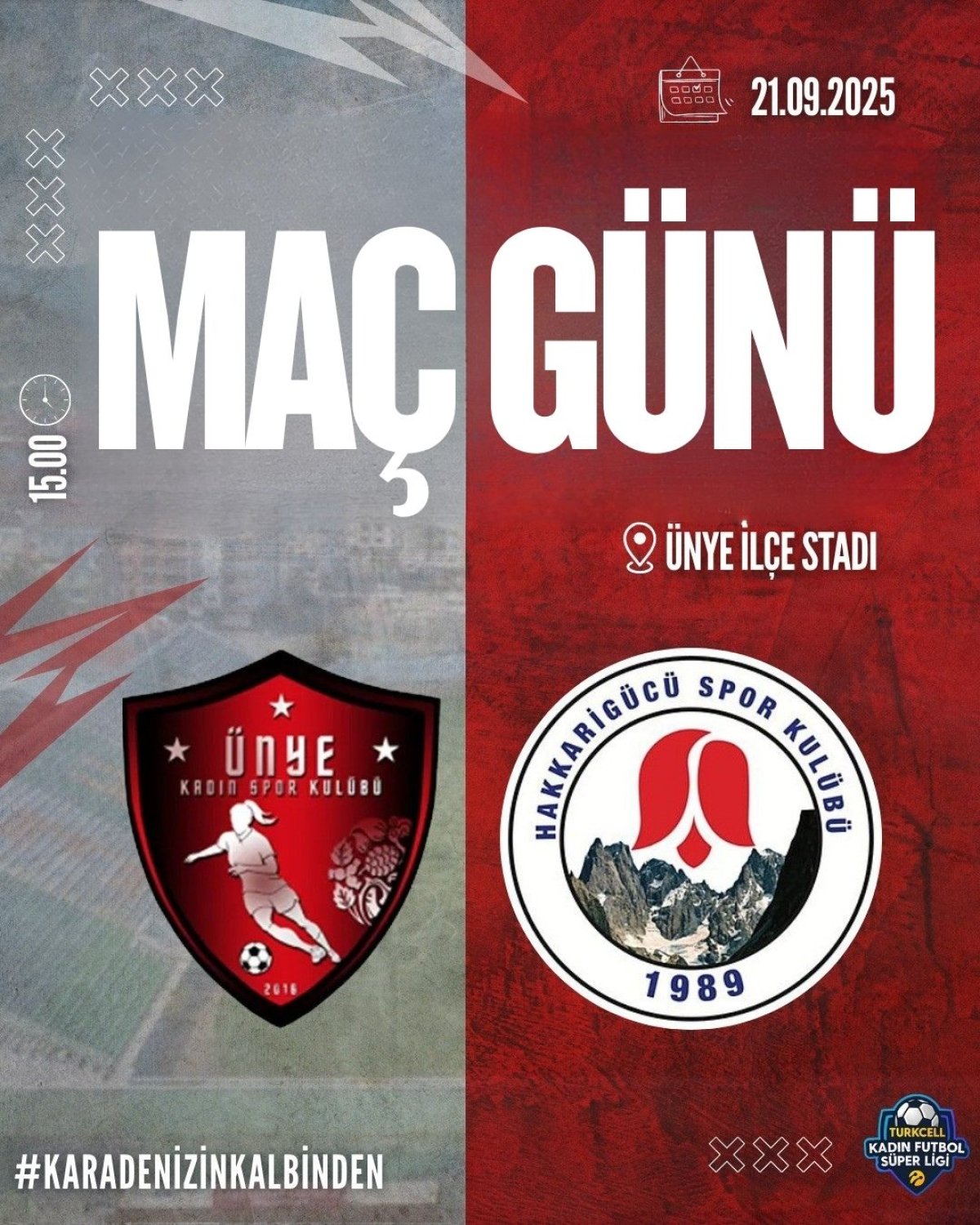 Ünye Kadın Spor Kulübü Turkcell Kadınlar Süper Ligi’nin 2025-2026 sezonuna yarın, 21 Eylül Pazar günü saat 15.00’te Ünye İlçe Stadı’nda oynayacağı Hakkarigücü Spor karşılaşmasıyla başlıyor.