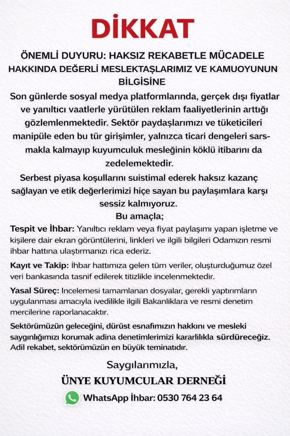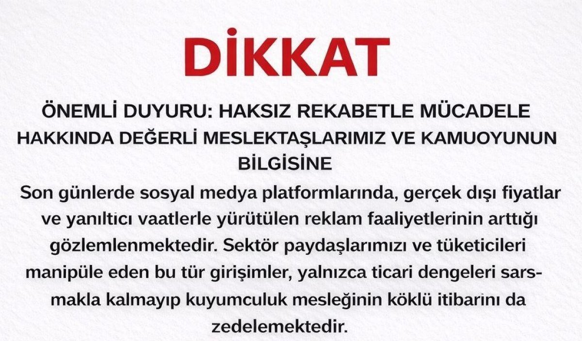 Serbest piyasa koşullarını suiistimal ederek haksız kazanç sağlayan ve etik değerlerimizi hiçe sayan bu paylaşımlara karşı sessiz kalmıyoruz. Bu amaçla tespit ve ihbar yanıltıcı reklam veya fiyat paylaşımı yapan işletme ve kişilere dair ekran görüntülerini, linkleri ve ilgili bilgileri odamızın resmi ihbar hattına ulaştırmanızı rica ederiz.