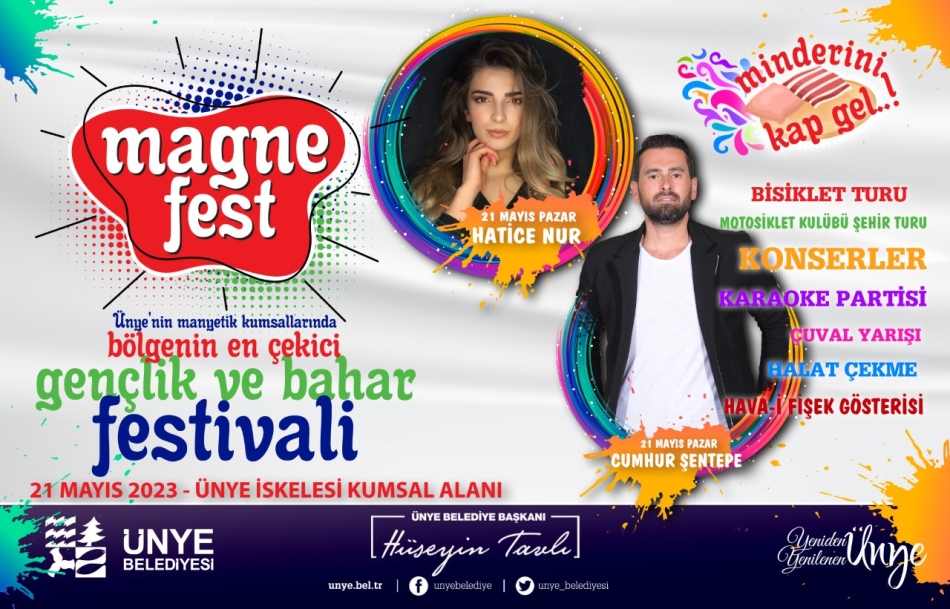 Ünye Belediye Başkanı Hüseyin Tavlı, MAGNEFEST Gençlik ve Bahar Festivali ile ilgili yaptığı açıklamada “19 Mayıs Atatürk’ü Anma Gençlik ve Spor Bayramı vesilesi ile geleneksel hale getirdiğimiz festivalimizi bu yıl da gerçekleştirmiş olacağız. Ünye’mizin manyetik kumsallarını da içine kattığımız, aynı zamanda Mayıs yedisi olarak bildiğimiz geleneksel ritüelimizi de dâhil ettiğimiz bir festivali düzenlemiş oluyoruz. Bölgenin en farklı festivali olan Geleneksel MAGNEFEST Gençlik ve Bahar Festivalimize herkesi davet ediyorum” dedi.