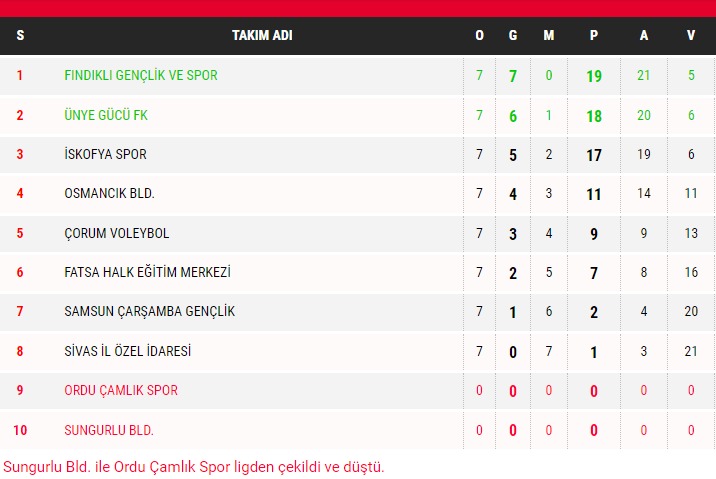 Çorum Atatürk Spor Salonu'nda elde ettikleri galibiyetle büyük coşku ve heyecan yaşayan Ünye Gücü FK Kadın Voleybol Takımı oyuncuları 9 haftalık ilk devrede oynadığı 7 maçtan 6'sını kazanarak puan tablosunda Fındıklı Gençlikspor'un 1 puan gerisinde 18 puanla sıralamadaki ikinciliğini korudu.