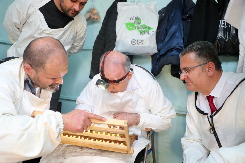 Vali Muammer Erol, ana arı yetiştiriciliği eğitim alanında 23 kursiyerlerin çalışmalarını yerince inceleyerek, kursiyerlere başarılar diledi.