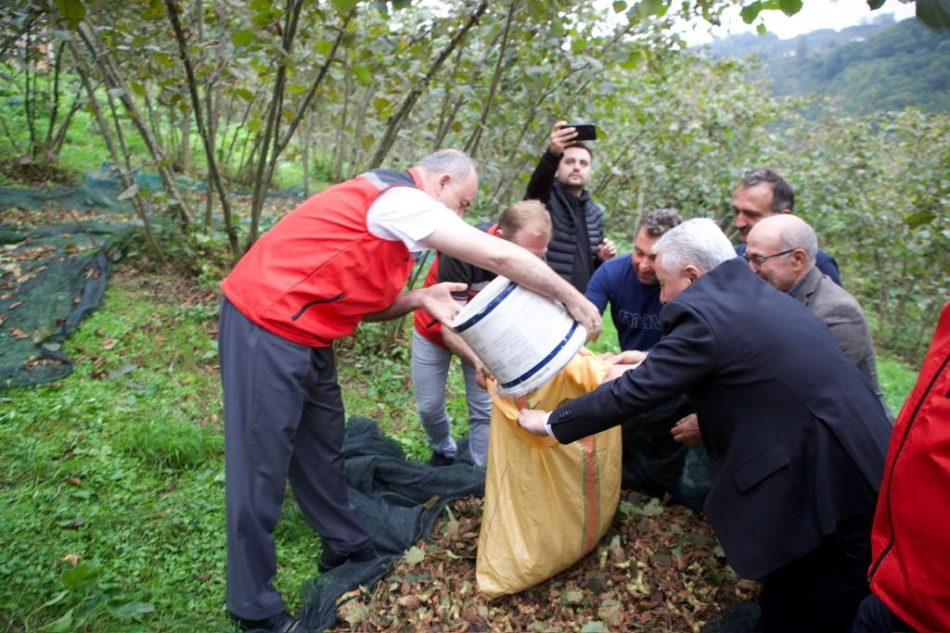 Bahçede hasat yapan işçilere kolaylıklar dileyen Vali Erol, beraberindekilerle file üzerinde bulunan fındıkları topladı.