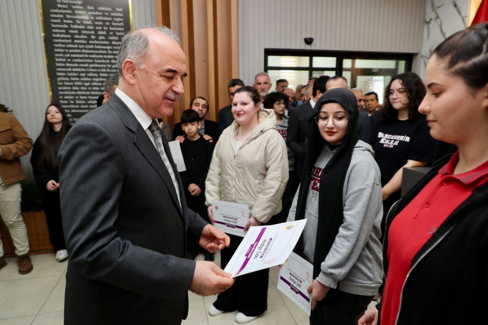 Vali Muammer Erol, ayrıca, ”Dilimizin Zenginlikleri “ Projesi çerçevesinde liseli öğrenciler arasında yapılan “Anlamını Bul Çevrimiçi Bilgi Yarışması”nda dereceye giren Altınordu Özel Namık Altaş Fen Lisesi öğrencisi Neslihan Kural, Altınordu Atatürk Anadolu Lisesi öğrencisi Merve Özkul ile Fatsa Necip Fazıl Kısakürek Anadolu Lisesi öğrencisi Duru Çoşkun’a da ödüllerini vererek, başarılarının devamını diledi.