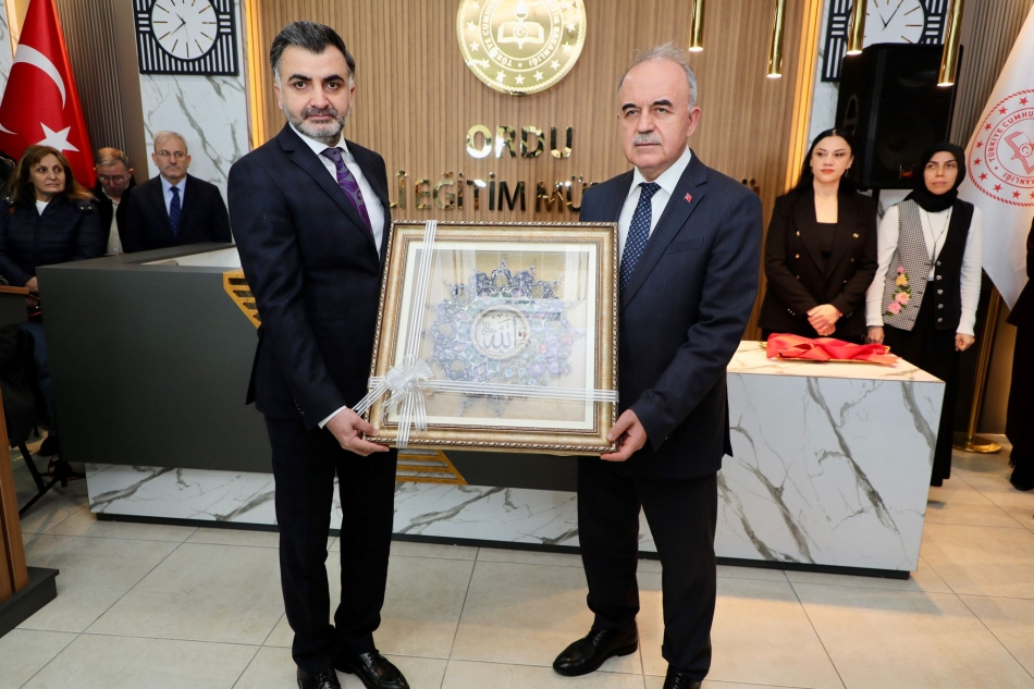 İl Milli Eğitim Müdürü Mehmet Fatih Vargeloğlu, gösterdiği yakın ilgisi ve desteği dolayısıyla Vali Muammer Erol’a el sanatlarından rölyef tablo takdim etti.