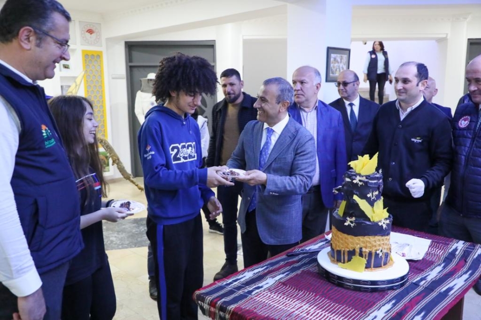Fidan dikiminin ardında, Ordu Arıcılık Araştırma Enstitüsü’nde, Vali Tuncay Sonel ve programa katılanlar tarafından arı ve balı sembolize eden pasta kesimi yapılarak, Dünya Arı Günü kutlandı.