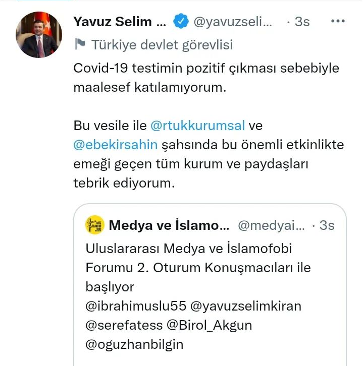 Uluslararası Medya ve İslamofobi Forumu 2. oturumuna konuşmacı olarak katılacak olan Dışişleri Bakan Yardımcısı Yavuz Selim Kıran, korona virüs testinin pozitif çıktığını ve foruma katılamayacağını söyledi.