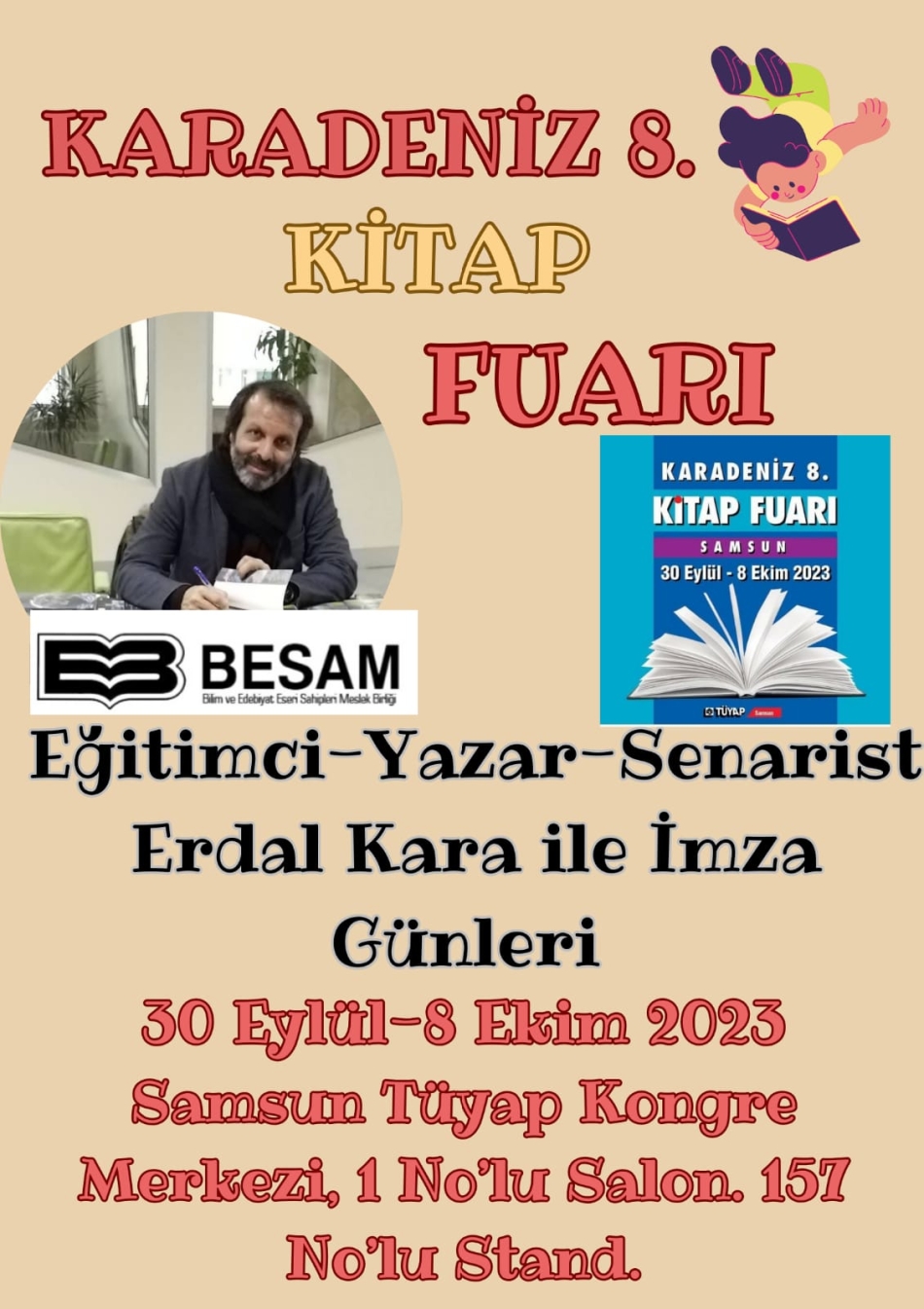 Ünye ve çevre ilçelerde eğitim camiasında uzun yıllar görev yapan Yazar Erdal Kara, 30 Eylül’de başlayan Karadeniz 8. Kitap Fuarı’nda söyleşi gerçekleştirecek.  Besam Meslek Birliği’nin 7 Ekim Cumartesi ve 8 Ekim Pazar günü Samsun Karadeniz 8. Kitap Fuarı’ndaki organizasyonuyla söyleşi yapacak olan Eğitimci - Yazar – Senarist Erdal Kara, okuyucu ve sanatseverleri Samsun’a bekliyor.