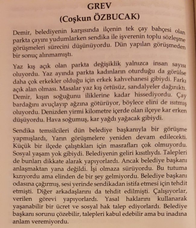 Samsun Bafra Eğitim Sen Temsilciliği’nin “İhsan Yılmazşamlı Öykü Yarışması” sonucu kitaplaştırılan 15 öykü içinde Yazar Coşkun Özbucak’ın “Grev” adlı öyküsü de yer aldı.