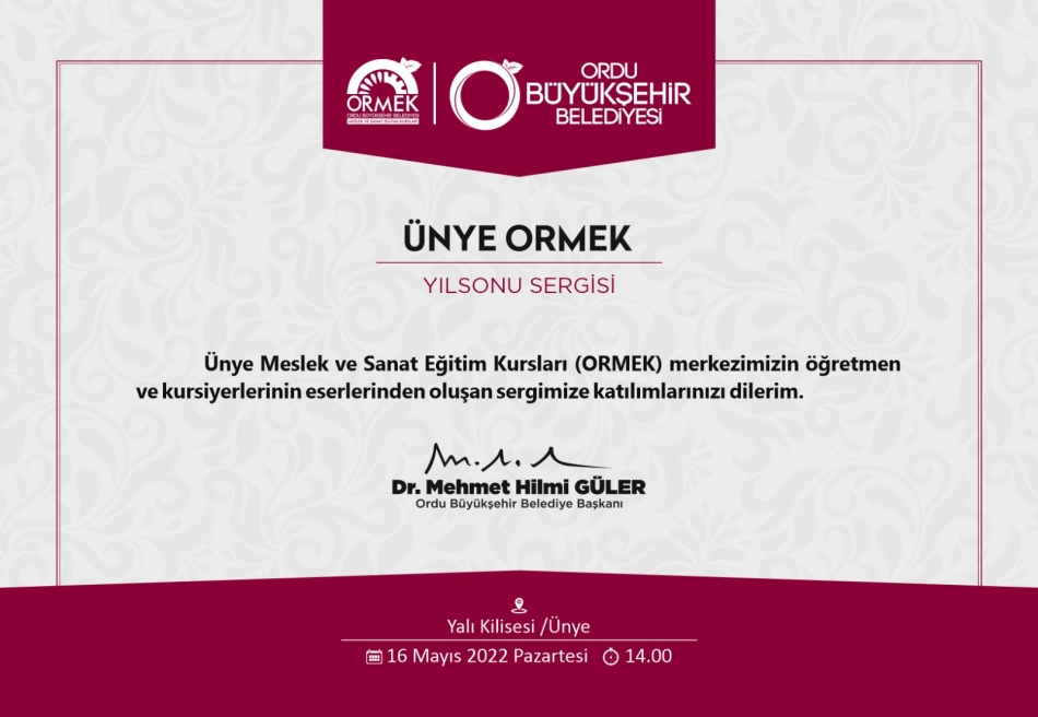 ORMEK yıl sonu sergisi 16 Mayıs Pazartesi günü Ordu Büyükşehir Belediye Başkanı Hilmi Güler önderliğinde günü Ünye Yalı Kilise' sinde açılacak. Öğretmenlerin ve kursiyerlerin bir yıl boyunca yapmış olduğu Sergide 22 farklı branştan ürün sergilenecek.