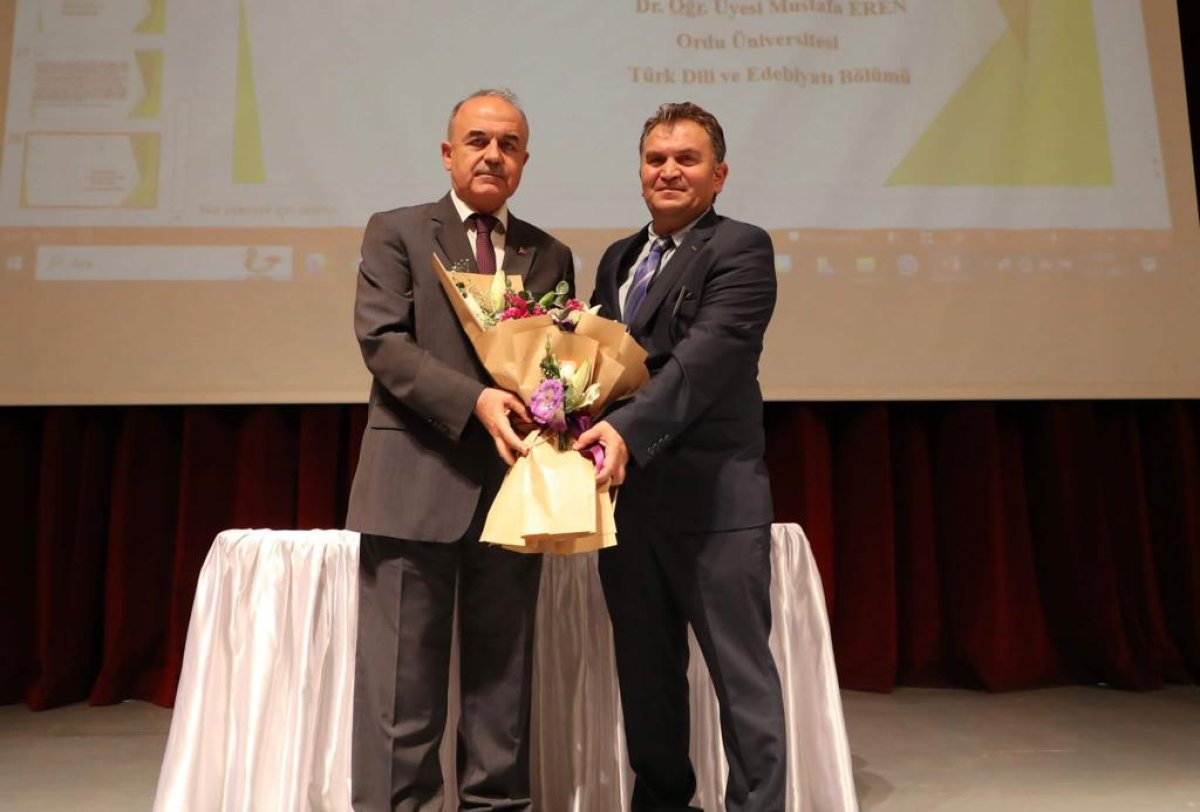 Vali Muammer Erol, konferansın sonunda ODÜ Türk Dili ve Edebiyatı Bölümü Öğretim Üyesi Dr. Mustafa Eren’e çiçek vererek, teşekkür etti.